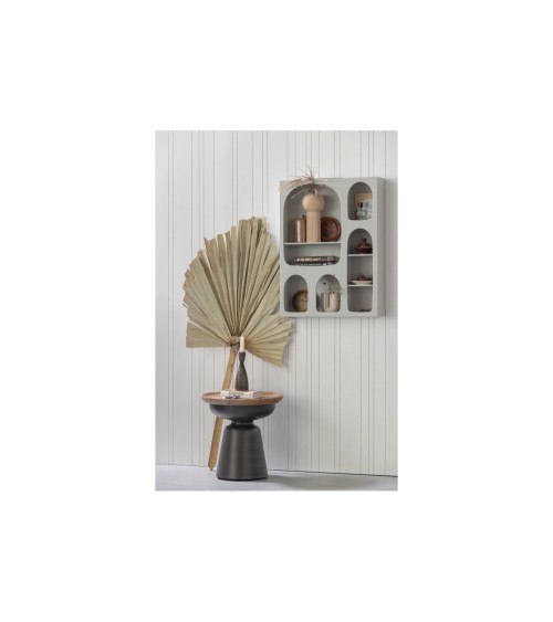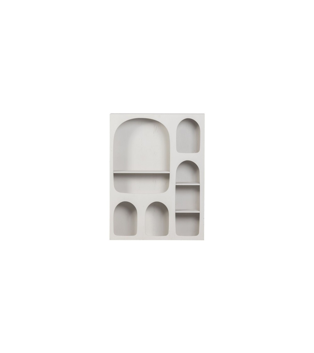 Barney est conçue dans un joli bois peint en blanc lumineux légèrement patiné, avec des niches découpées comportant des tablettes, pour laisser libre cours à votre imagination. Chacune de ces niches offre des dimensions généreuses : à gauche, le compartiment du haut (L 38 cm x H 35 cm) dispose d'une tablette. La niche du bas, avec une découpe à fenêtres, mesure 38 cm de large et 14 cm de haut. Côté droit, les niches mesurent 20 cm de large. Celle du haut mesure 17 de haut, et celle du bas avec ses tablettes, 26 cm. Chaque compartiment a une profondeur de 13 cm. L'option de suspension se trouve à l'arrière, en haut, à 1,5 cm des bords latéraux.
