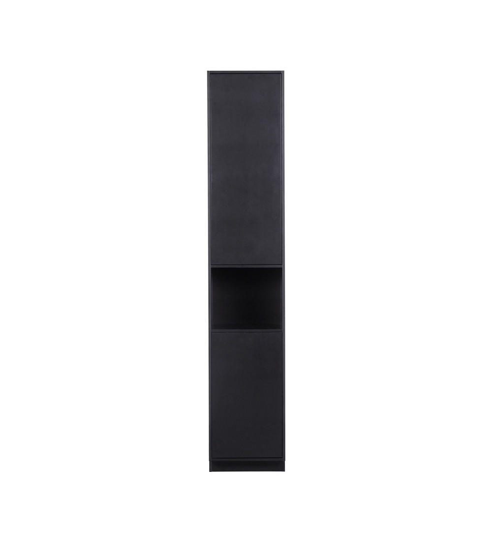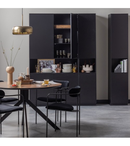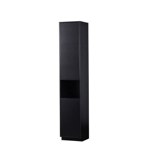 Une colonne de rangement, quelle bonne idée ! Le meuble de rangement Finca de Woood s'élève à une hauteur de 2,10 m pour une profondeur de 40 cm et une largeur mini de 39,5 cm : une vraie silhouette de sylphide. La colonne Finca est réalisée dans un beau bois de pin massif teint en noir, LA teinte tendance en matière de décoration d'intérieur. Accordez-la avec des meubles en bois sombre ou jouez les contrastes avec un mobilier et des murs clairs.Le meuble de rangement Finca de Woood déploie 6 compartiments de 32 cm de haut, 38 cm de large et 37 cm de profondeur chacun. Autour d'une niche centrale, les étagères se répartissent harmonieusement en trois rangements dans la partie supérieure et deux dans la partie inférieure. Chacun est dissimulé derrière une porte bénéficiant d'un système d'ouverture push-to-open : plus besoin de poignées ! Chaque étagère peut supporter 10 kg : c'est le moment d'exposer vos plus belles pièces de vaisselle et de ranger celle du quotidien, ou de convertir cette colonne de rangement en bibliothèque petit volume. Envie d'un salon façon all-over ? Piochez dans la collection Finca pour créer un module de rangement sur-mesure avec les autres meubles de la gamme : enfilade de rangement, meuble TV intégré, vaisselier, à vous de jouer !