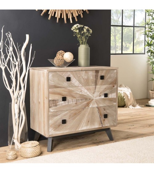 Commode beige scandi 4 tiroirs pieds noirs Sapin. Dimensions : 80 x 40 x 77 cm . Article en MDF plaqué sapin et Sapin.  Cet article est composé de bois de sapin blanchi !  La finition de cette gamme est faite pour éclaircir le bois et rendre ces meubles exclusifs. Chaque produit est unique et peut varier selon la patine. Cette sublime commode tendance éclaircira votre pièce de vie à chaque instant et agrémentera vos journées.  Ses quatre grands tiroirs optimiseront l'espace dans votre maison. Ses différentes teintes claires adouciront l'atmosphère et rendront votre salon ou votre chambre unique. Ce meuble fantaisie fabriqué en bois de sapin blanchi vous fera découvrir le monde Scandinave à travers cette collection rayonnante.