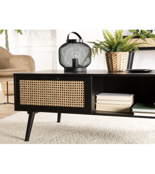 Table basse 1 niche 2 tiroirs en pin cannage couleur noire L100