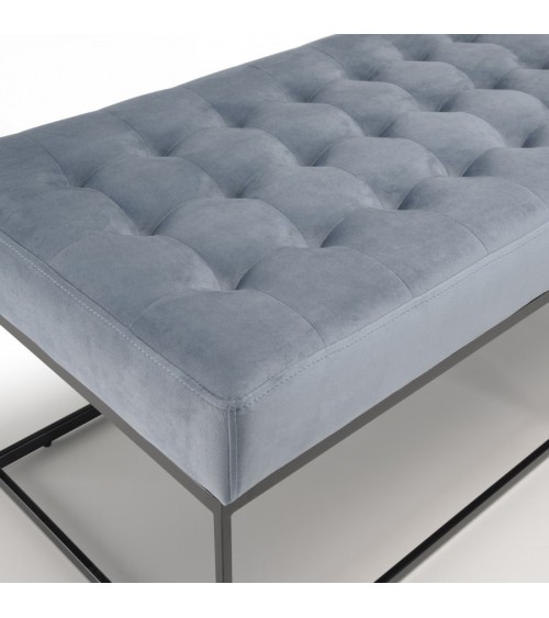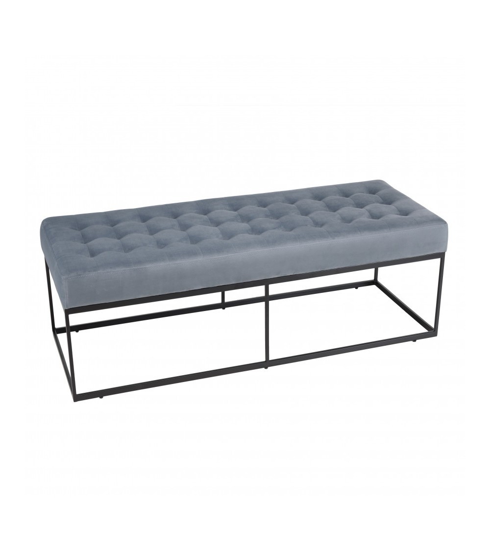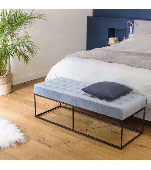 Banc en velours bleu clair capitonné structure métal noir. Dimensions : 120 x 47 x 42 cm. Article en Velours / Mousse / Acier. Le confort est votre priorité ? Ce banc de lit va donc vous convenir Sa matière douce et moelleuse fera votre bonheur au quotidien ! Doté d'une structure en métal noir et d'une assise de couleur bleu clair, le mélange de matières est très joli et convient à tout type de décoration.