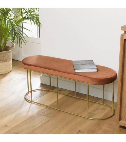 Banc velours orange pieds arrondis métal doré. Dimensions : 105 x 36 x 42 cm. Article en Velours Polyester / Mousse / Acier / Contreplaqué. Créez une atmosphère chaleureuse dans votre pièce ! Ce banc de lit en velours est idéal pour donner du cachet à votre intérieur. Son assise est élégante et confortable grâce à la douceur du velours. Ses pieds en métal doré ajoutent un côté chic à ce meuble qui vous séduira en un clin d'il