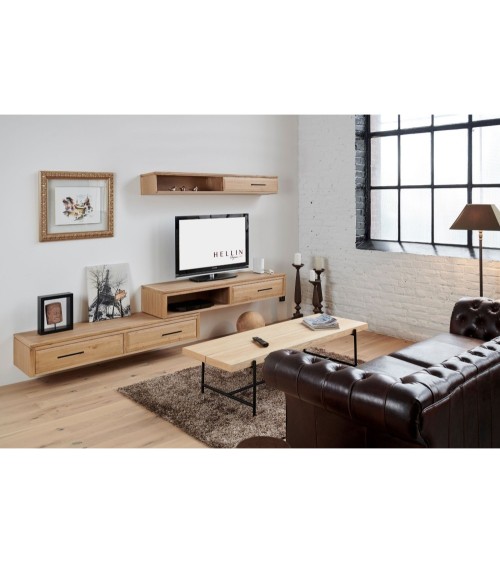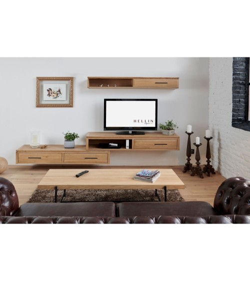 L'élément mural BOSTON (2 tiroirs) est un meuble suspendu pratique et décoratif qui s'adapte à toutes les pièces de votre maison. Dans votre salon, dans votre chambre ou dans votre entrée vous pouvez aménager vos murs selon vos besoins avec un minimum d'encombrement. Un meuble télé de grande longueurTrès contemporain et moderne ce meuble assemblé en tenon / mortaise offre une surface de 160 cm de longueur, idéale pour accueillir votre téléviseur et/ou vos objets décoratifs. Il dispose encore de deux magnifiques tiroirs qui se différencient par la forme incurvée de ses façades et par le contraste de couleurs entre le chêne naturel et les poignées métalliques noires. Moderne et original, vous pouvez coordonner cet élément avec les autres pièces de cette collection pour créer votre coin TV unique et personnalisé, adapté à vos besoins. Un meuble TV suspendu conçu par HellinLa série Boston est une exclusivité Hellin. Utilisant le chêne comme matière principale, cette série de meubles suspendus a été pensée et conçue dans nos ateliers pour les passionnées d'intérieures design et modernes. Fabriqués en utilisant des techniques d'assemblage d'ébénisterie, ces meubles se distinguent par ses finitions particulières et soignées. En choisissant une fixation murale, ces meubles permettent un aménagement pratique, fonctionnel et peu encombrant. Très contemporaine, cette série se décline en deux finitions : chêne clair et chêne blanchi apportant de la chaleur et de l'élégance à votre intérieur. Ces éléments se coordonnent avec tous les éléments de la gamme BOSTON. Description technique : Dimensions : L 160 x P 41 x H 25 cm Dimensions utiles des tiroirs : L 70,5 x P 31 x H 14,5 cm