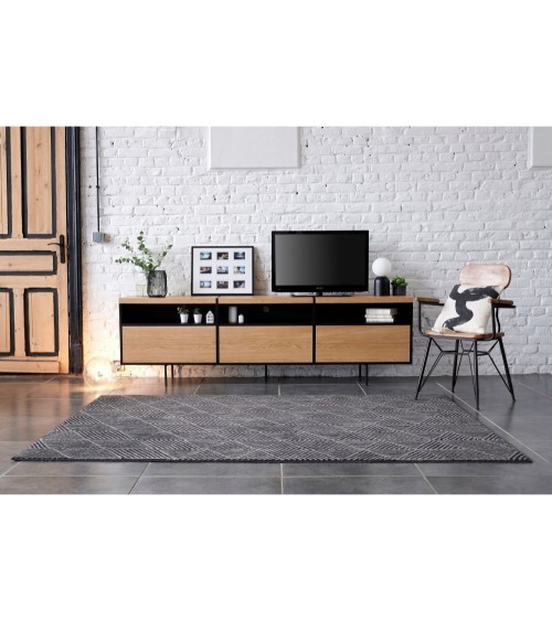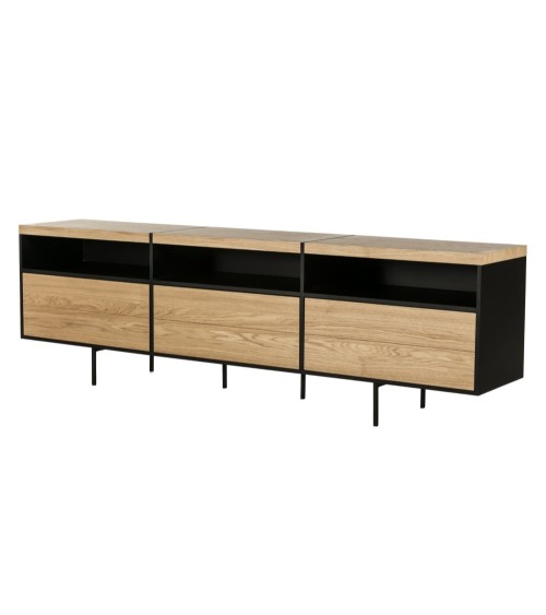 Le meuble tv bas en bois BRIGHTON est une exclusivité HELLIN !Le meuble de rangement bas assume pleinement son style contemporain à travers une construction très rythmée alternant la chaleur du chêne naturel avec des éléments en bois teintées noir. Légèrement suspendu par un piétement discret en métal noir, il sera mis à l'honneur dans une grande pièce de vie comme un salon ou une salle à manger en enfilade.Un meuble TV bas à utiliser en buffet basSes 3 portes abattants, équipées d'un système d'ouverture ''push'' soulignent les 3 niches de rangement supérieur.Ses dimensions généreuses vous permettront de ranger tous vos les appareils audio et vidéo même les plus encombrants. Description technique : Dimensions : L: 220 x H: 65 x P: 42 cm Dimensions utiles des niches ouvertes : L 71 x P 41 x H 15 cm Dimensions utiles de l'espace rangement (portes) : L 71 x P 41 x H 28 cm Hauteur des pieds : 16,5 cm 1 passe câble au niveau de la niche ouverte central h 55,5 cm Epaisseur plateau : 40 mm Poids : 68 kg Piétement en métal, finition epoxy noir Portes plaquées chêne naturel Meuble livré monté (pieds à assembler)...