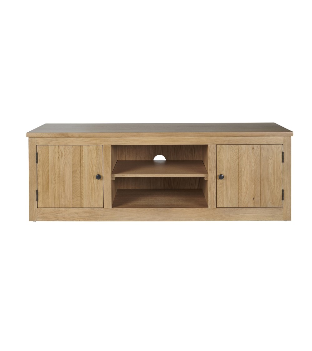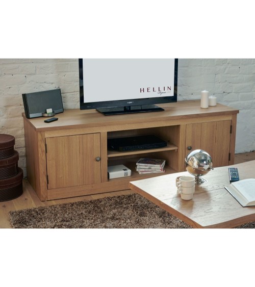 Ce meuble TV en chêne massif vous offre un rangement pratique et sophistiqué pour vos appareils hifi à l'aide de ses deux niches fermées et de sa niche centrale ouverte.Un meuble télé moderne et solideEpuré au maximum, le meuble télé Victoria ne jure que par la noblesse de son bois massif et ses lignes discrètes sur les portes. Description technique : Plateau, structure et portes en chêne massif, arrière plaqué chêne Dimensions : L 150 x P 50 x H 51 cm Poids : 55 Kg Dimensions utiles :- Niche centrale : L 55 x P 46 x H 35,5 cm- Niches droite et gauche : L 37,5 x P 44 x H 35,5 cm- Plateau de 25 mm d'épaisseur en chêne massif- Epaisseur des portes : 33 mm- Epaisseur des tablettes : 15 mm 3 tablettes non réglables ni amoviblesMeuble livré monté.Fabriqué en Europe....