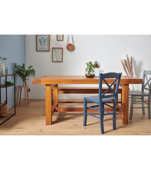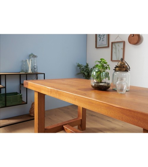 Superbe table de ferme 100 % chêne. Cette édition entièrement montée et finie à la main est une pièce unique. Robuste et raffinée, elle témoignera des repas quotidiens et des fêtes entre amis.Une table de ferme montée de façon traditionnelle Le plateau, renforcé par une ceinture épaisse, est panneauté selon les pratiques des ébénistes d'autrefois. Deux chevilles en chêne à chaque angle scellent les tenons/mortaises, et garantissent une parfaite rigidité du plateau. Même le pied de la table est assemblé à l'ancienne. Cette table peut recevoir deux allonges.La table de ferme et 18 autres meubles en bois massif de la gamme LA BRESSE sont désormais disponibles en finition chêne clair. Cette finition sublime la matière et redessine la collection des meubles de tradition. Description technique : Table de ferme L 1800mm - capacité d'accueil 8 à 12 personnesDimensions : L 180 x H 76 x P 90 cm Poids 85 kgFabriqué en 100% chêne issu de forêts durablement gérées.Ceinture épaisse de 80 mm d'épaisseur. Assemblage traditionnel par tenon mortaise.Finition semi-antiquaire, patine à l'ancienne et vernis polyuréthane appliqués à la main.Teinte chêne moyen ou chêne clair.Livrée en 2 colis - Table à assembler (assemblage facile) Dimensions des colis : L 185 x P 94 x H 11 cm et L 85 x P 73 x H 22 cmDécou...
