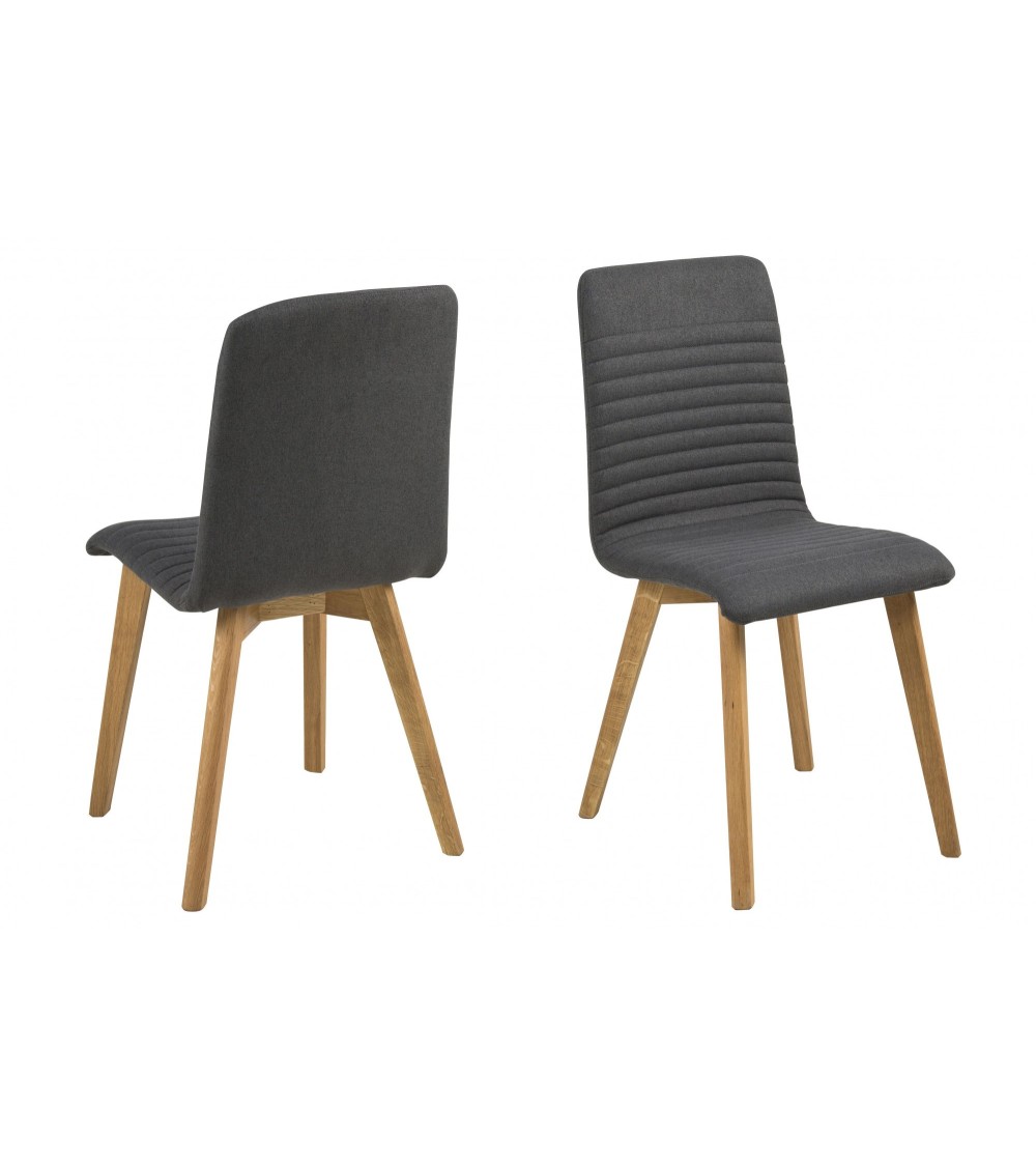 Lot de 2 chaises en bois et tissu.Un style rétro scandinaveÀ la fois vintage et moderne, la chaise Rosa mélange design scandinave des années 50 et tendances actuelles. Parfaite pour compléter la table de la salle à manger ou de la cuisine, elle trouve également sa place dans un long couloir ou un salon. Alliant chêne et tissu, elle est dotée de petits détails travaillés : pieds obliques et coutures discrètes sur l'assise.Une chaise en tissu matelasséMatelassée, arrondie et ergonomique, son assise en tissu est très confortable. Constitués de chêne massif, ses pieds sont extrêmement résistants.Cette chaise tissu est aussi proposée dans d'autres coloris : vert et gris clair. Description technique : Chaises livrées démontées Piétement en chêne massif huilé Revêtement en tissu 100% polyester Disponible en coloris gris clair, anthracite et vert Hauteur de l'assise : 47,5 centimètres Profondeur de l'assise : 41,5 centimètres Conçues dans le respect de l'environnement Conformes à la régulation Timber No 995/2010 de l'Union Européenne...