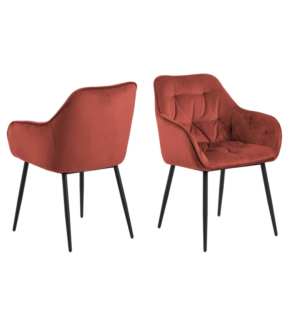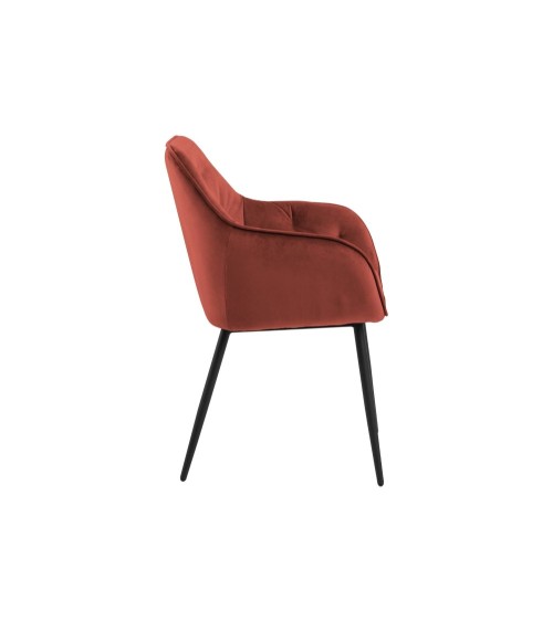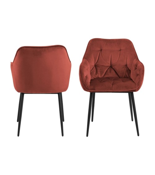 Ajoutez de l'élégance à votre salle à manger avec les chaises en tissu TERI.Ces fauteuils de salle à manger, sont revêtus d'un velours capitonné très doux et reposent sur quatre pieds métalliques, fins et fuselés. Résolument modernes, ils accueilleront vos invités pour longues heures autour de repas conviviaux.S'accordent à la perfection aux salles à manger contemporaines et actuelles. Pour une ambiance homogène et soignée, vous pourrez les associer à une table au piétement métallique noir et au plateau bois. Description technique : Fauteuils de salle à manger en tissu et métalDimensions : L 58 x P 55 x H 83 cmPoids : 7,8 x 2 KgHauteur des pieds : 41 cmHauteur d'assise : 47 cmLargeur d'assise : 41 cmProfondeur d'assise : 40,5 cmHauteur d'accoudoir : 19 cmHauteur d'accoudoir jusqu'au sol : 67 cmLargeur d'accoudoir : 4 cmProfondeur d'accoudoir : 35 cmHauteur de dossier : 37 cmCapacité de poids maximale : 110 KgMatières : tissu aspect velours 100% polyester, métal noir mateColoris : rose poudré, gris, vert, rouge corail, gris brunColis :Vendu par lot de 2. Pieds à assembler.Dimensions du carton : L 59 x P 57,5 x H 60 cm 17,6 Kg...