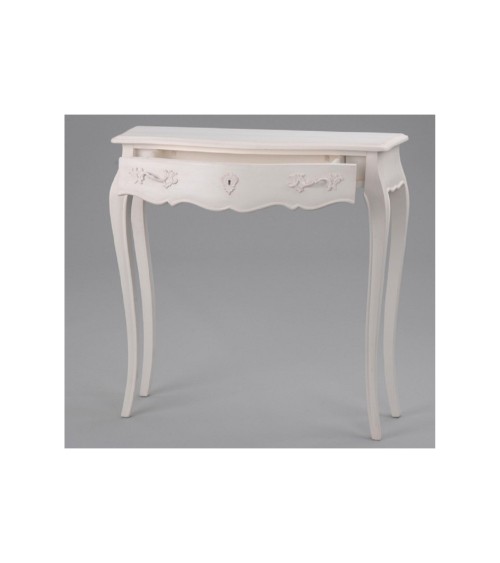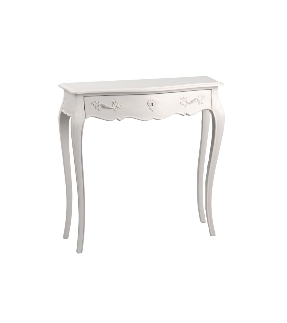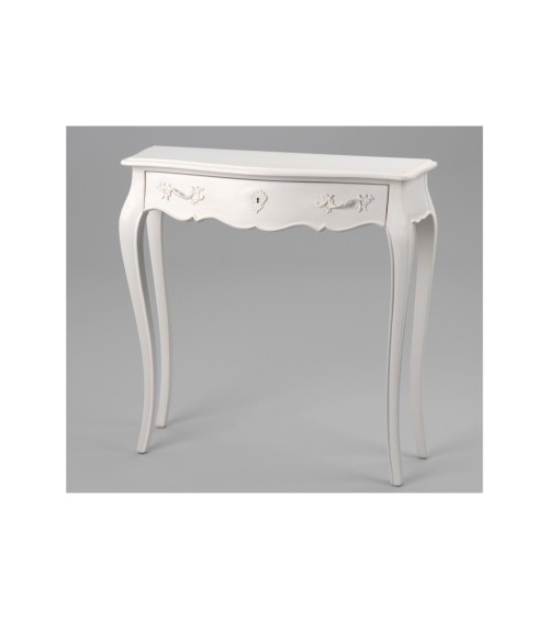 Petit meuble baroque en bois acajou blanc très élégant qui se placera dans une entrée ou salon.Ce meuble ouvrant par un tiroir et comportant de jolis pieds en forme de courbe modernisera votre intérieur.Vous pouvez y poser une plante, une lampe ou tout autre objet de décoration. Elle amènera du charme et de l'élégance à votre intérieur.Coup de coeur assuré ! Description technique : Petit meuble console de la gamme MurianeDimensions : L 90 x P 25 x H 90Hauteur des pieds : 73 cm1 tiroirCouleur : Blanc Matières : acajouPoids : 12 Kg...