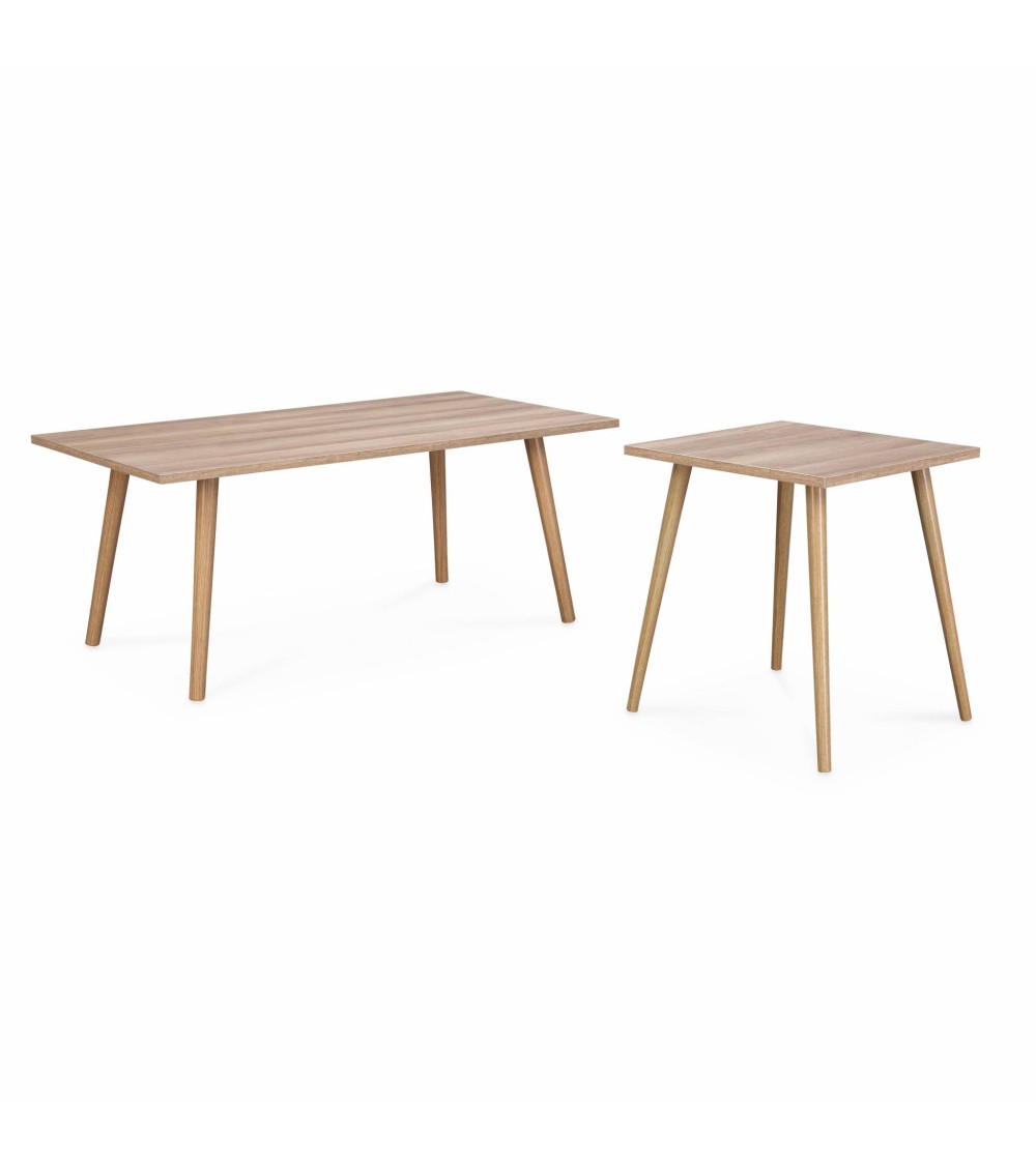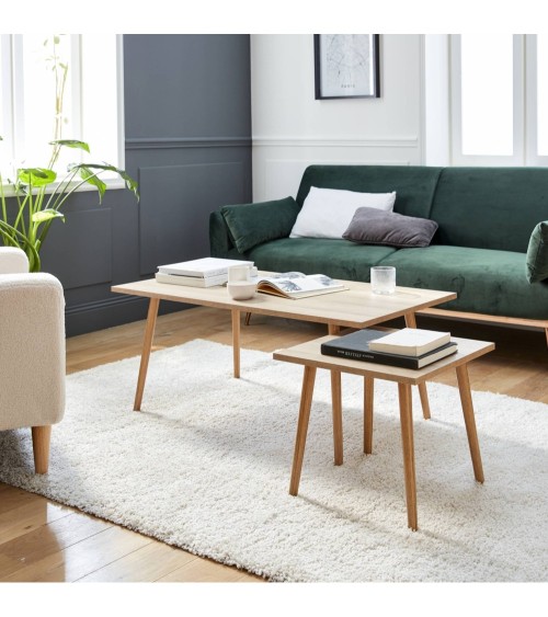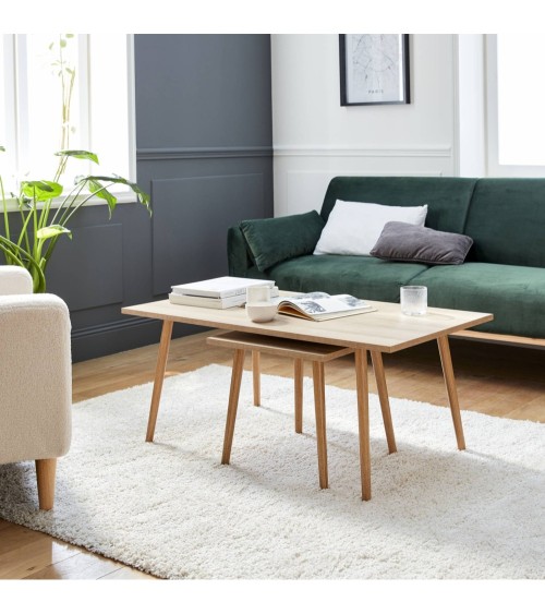 Tables basses en décor bois - Scandi  Les + produitPieds compasLégère à déplacer Piètement bois  La collection SCANDI s'inspire des meubles aux lignes fines et pures, issus de la culture scandinave. Comprenant une table basse, un buffet et un meuble TV, la gamme SCANDI vous offre la possibilité d'habiller et meubler vos pièces de vie tant de façon rétro et élégante que fonctionnelle et pratique.  Un lot de tables basses au style scandinave Jouez avec les tailles grâce à ce lot de deux tables basses au design naturel et tout en simplicité. Rassemblées au centre de votre salon ou séparées, elles meublent votre intérieur de façon élégante. Elles se fondent dans toutes les décorations pour habiller votre salon selon vos envies. Le style scandinave allie des pieds compas avec des panneaux stratifiés décor bois, il apporte une touche chaleureuse à votre pièce de vie. Que ce soit pour accueillir vos objets déco, vos plantes ou pour les apéritifs, ces tables basses deviendront vite des indispensables de votre quotidien.