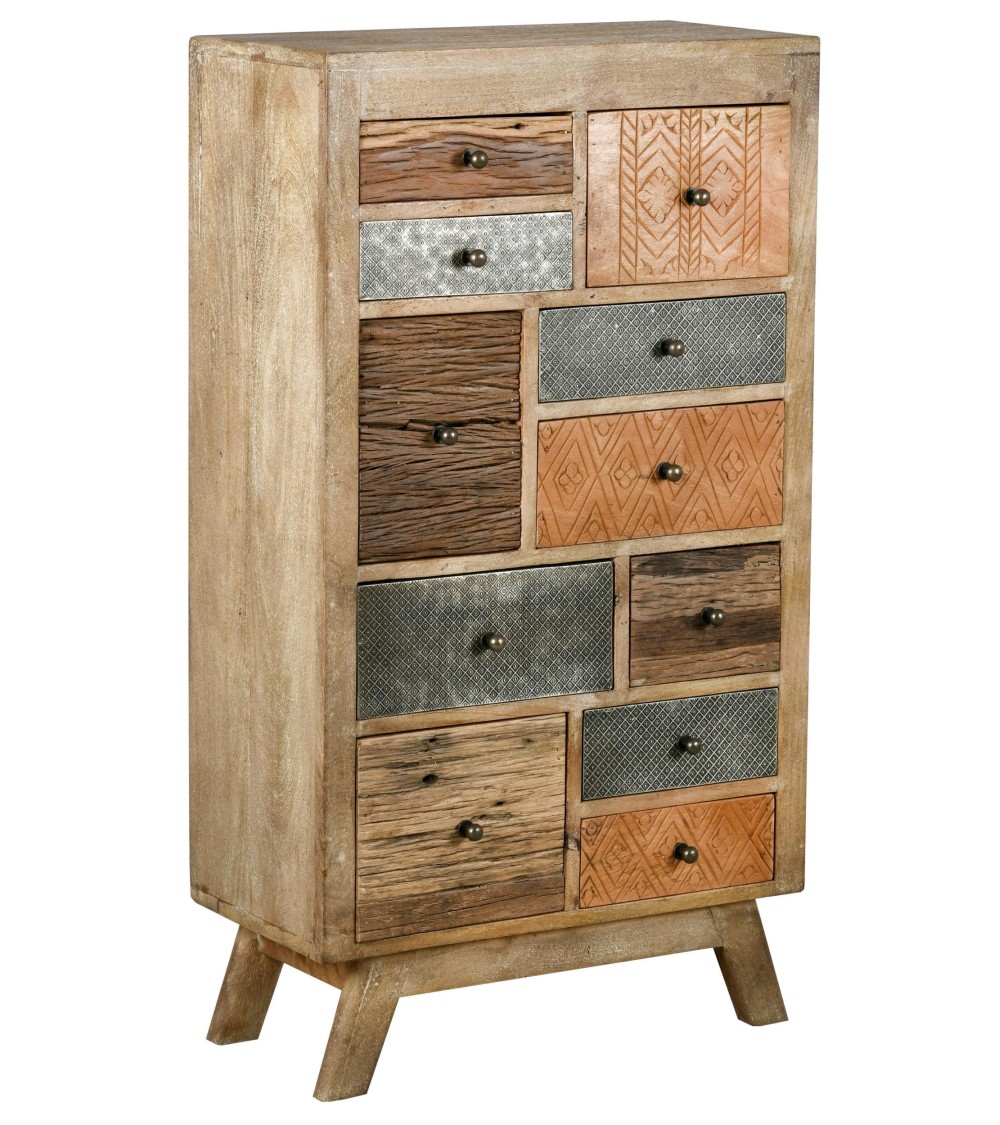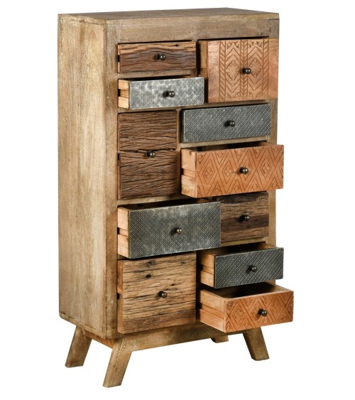 Aspect : Matériau principal : ManguierMatériaux secondaires : MétalDimensions : Hauteur (en cm) : 108,00Longueur (en cm) : 60,00Profondeur (en cm) : 30,00Autres caractéristiques : Informations complémentaires : Poignées en métal , façades sculptées à la mainLivré monté : OuiPoids (en kg) : 45 Commode en manguier avec 11 tiroirs asymétriques