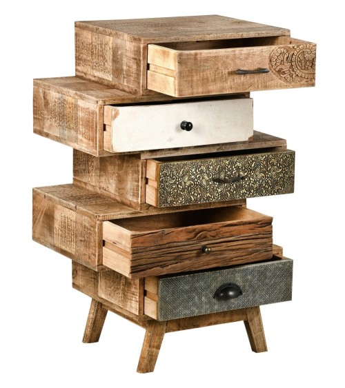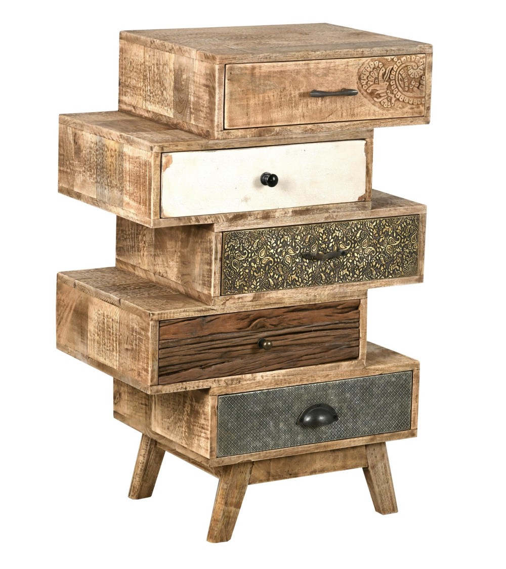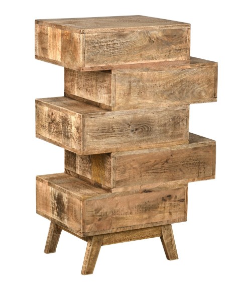 Aspect : Matériau principal : ManguierMatériaux secondaires : MétalDimensions : Hauteur (en cm) : 90,00Longueur (en cm) : 57,00Profondeur (en cm) : 37,00Autres caractéristiques : Informations complémentaires : Poignées en métal , façades sculptées à la mainLivré monté : OuiPoids (en kg) : 40 Commode zig-zag en manguier