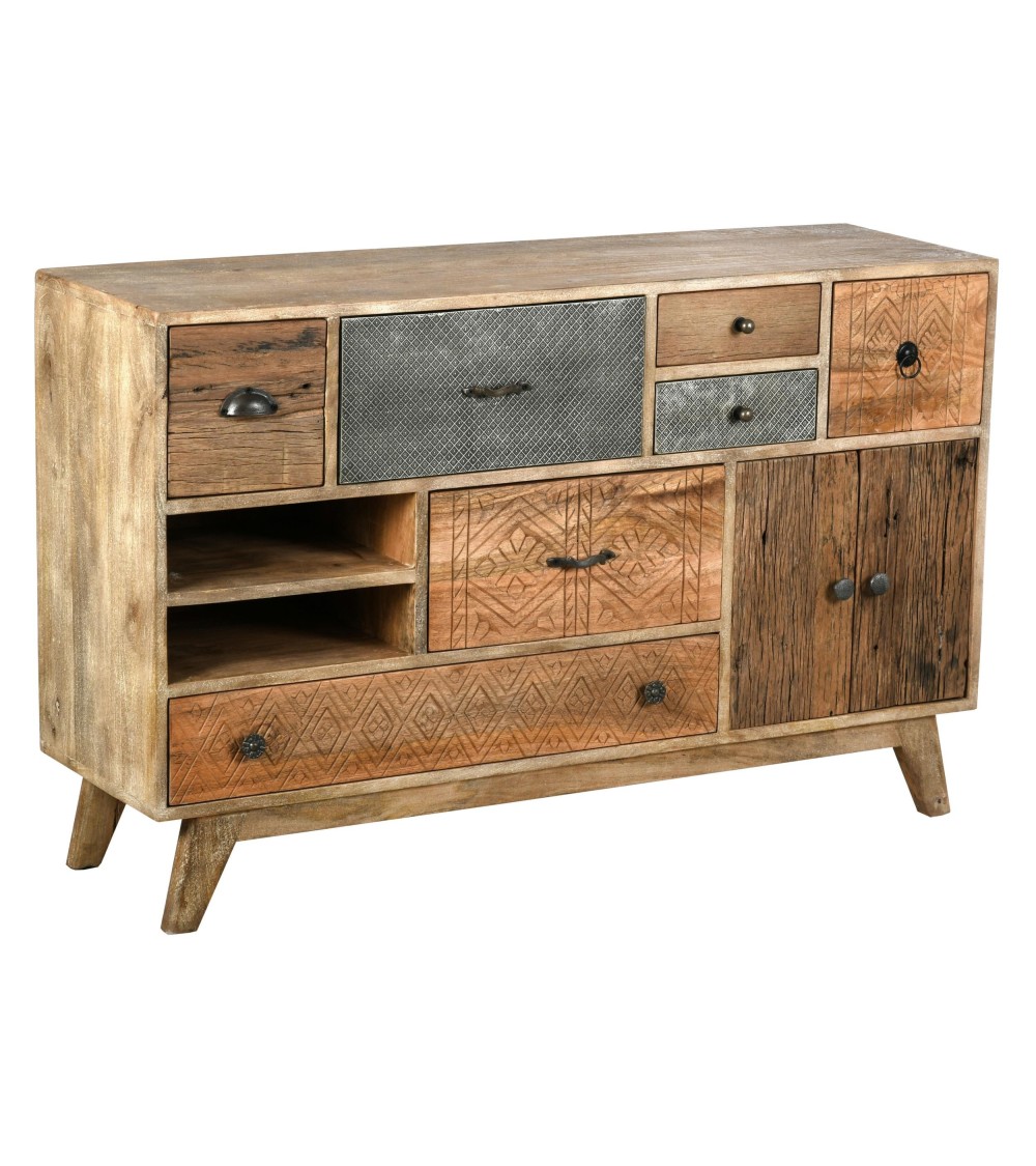 Aspect : Matériau principal : ManguierMatériaux secondaires : MétalDimensions : Hauteur (en cm) : 76,00Longueur (en cm) : 120,00Profondeur (en cm) : 35,00Autres caractéristiques : Informations complémentaires : Poignées en métal , façades sculptées à la mainLivré monté : OuiPoids (en kg) : 62 Commode asymétrique en manguier 7 tiroirs et 2 portes avec étagères