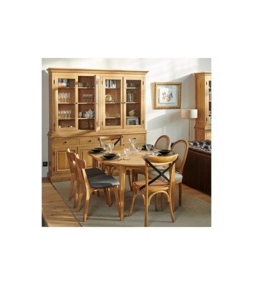Ce vaisselier en chêne, aux dimensions généreuses est le champion de la capacité de rangement. Doté de 4 grandes portes vitrées, l'élément haut est aménagé avec 6 tablettes en bois pour recevoir vos verres ou tous vos livres. En partie basse, 4 portes en chêne massif s'ouvrent entièrement pour faciliter l'accès aux 2 espaces de rangement séparés par une tablette en bois. Dans la salle à manger, il impose un style raffiné et deviendra la pièce centrale de votre aménagement.Ses lignes harmonieuses et ses moulures discrètes laissent place à une capacité de rangement généreuse et une hauteur imposante. Les quatre portes et les quatre tiroirs de rangement de l'élément bas reposent sur un élégant socle en chêne massif. Les portes sont montées sur des charnières discrètes à ouverture totale. La corniche donne du relief et de la prestance à l'ensemble du meuble. Le vaisselier Victoria en chêne patiné est assemblé dans le pur respect de la tradition. Retrouvez ce meuble en version 2 portes (Réf : 02011) ou en version portes coulissantes (Réf : 02093).Livraison du vaisselier bois Victoria Du fait de son volume important, ce buffet vaisselier doit être livré à domicile avec l'option ''livraison confort''. La livraison sera réalisée en rez-de-jardin.Contactez le service clientèle pour l'étude d'une livraison en étage ou dans la pièce de votre choix. Description technique : Réalisé en chêne massif, côtés panneautés et arrière en placage chêne. Assemblage des tiroirs par queue d'aronde de façon traditionnelle. 4 tiroirs en chêne massif qui reposent sur des coulisses en bois. Portes e...