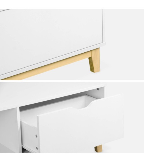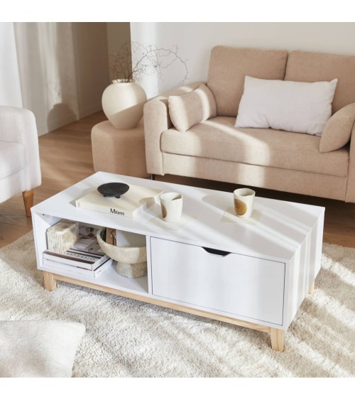 Table basse scandinave blanche, 1 tiroir - Floki   Les + produit Pieds en bois de sapin Possède 1 tiroir et 1 espace de rangementFacile à nettoyerAvec notre collection Floki, le design scandinave na pas fini de vous séduire ! On y retrouve tout ce qui fait le charme des meubles nordiques. Le mariage harmonieux du blanc polaire et des pieds en bois sur des lignes droites et des formes épurées. Table de chevet, bibliothèque, buffet, table basse, console ou meuble tv, laissez-vous tenter par nos meubles astucieux qui apporteront à votre intérieur un style chaleureux et moderne. Une table basse astucieuseApéritif improvisé entre amis ou café en famille, la table basse Floki deviendra vite un incontournable de votre salon et de tous vos moments conviviaux. Elle vous offre un beau plateau pour recevoir vos invités confortablement. Cette table est dotée d'un espace de rangement ouvert pour glisser des livres et des magazines et d'un tiroir très pratique pour ranger vos affaires, comme les télécommandes, à l'abri des regards. Un design rétro et élégant La table basse Floki vous séduira au premier coup d'oeil. Des lignes épurées, une structure blanche qui rappelle les meubles scandinaves et des pieds en bois de sapin qui ajoutent la touche vintage qu'on adore. Elégante,
