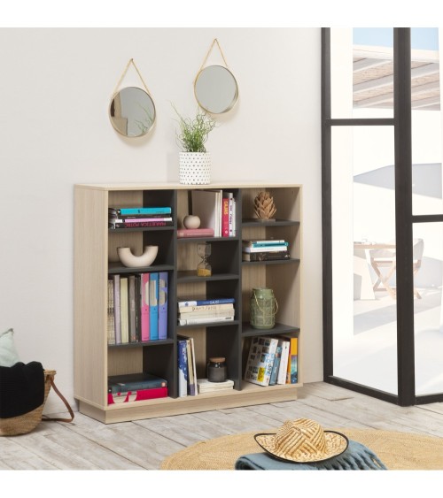 Étagère Bibliothèque Fabrique en Espagne en MDf de 15 mm la meilleure qualité en couleur chêne. 12 niches de différentes dimensions réalisées avec étagères en couleur Gris Foncé pour profiter au maximum de l'espace de rangement.Chaque niche a une profondeur de 31cm , ce qui est idéal pour ranger des livres, dossiers, cartons..Ce meuble multifonctionnel, se peut utiliser comme bibliothèque classique ou pour bureau.La collection d'étagères Vigo dispose de 3 dimensions disponibles et regroupables entre elles qui lui apporteront une touche élégante à l'espace où la pièce soit placée.Produit en kit et facil à assembler, se livre avec notice de montage et les outils pertinents pour un assemblage optimale.DIMENSIONS: 110cm longueur, 33cm Profondeur et 110cm Hauteur.