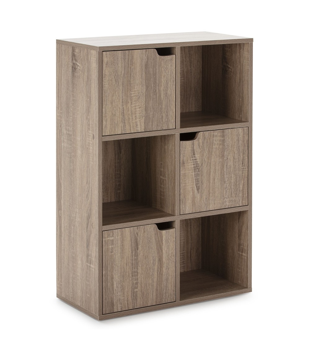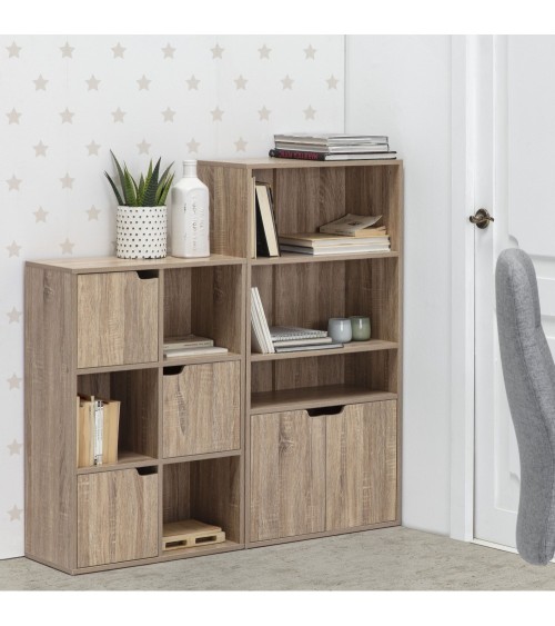Étagère modèle MartiCaractéristiques principales de l'étagère:· Bibliothèque à cubes et portes.· Style moderne et simple.· Utilisez cette étagère pour embellir et trier votre maison.· Cette unité de rangement de cubes a une grande capacité et a suffisamment d'espace pour répondre à divers besoins de rangement, et peut contenir tout de vos livres et décorations aux vêtements et jouets.· Le design de l'étagère est simple, couleur chêne, s'adapte parfaitement à différents endroits de votre maison tels que le studio, le salon, la chambre, elle peut s'intégrer parfaitement au style de votre maison.Dimensions et poids:· Dimensions totales maximales de l'étagère 5 portes et 4 niches (L x l x H) : 90 x 29 x 90 cm.· Dimensions totales maximales de l'étagère à 3 portes et 3 compartiments (L x l x H) : 60 x 29 x 90 cm.· Dimensions totales maximales de l'étagère à 2 portes et 3 niches (L x l x H) : 60 x 29 x 119 cm.· Épaisseur du plateau : env. 10 mm.· Poids maximum supporté par la table : 60 kg· Matériau : Panneau de particules