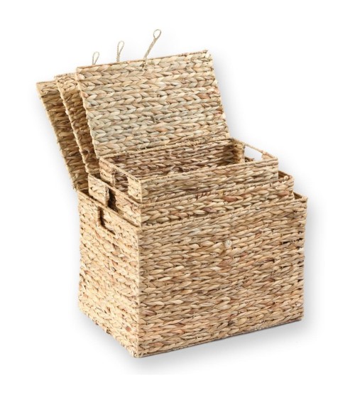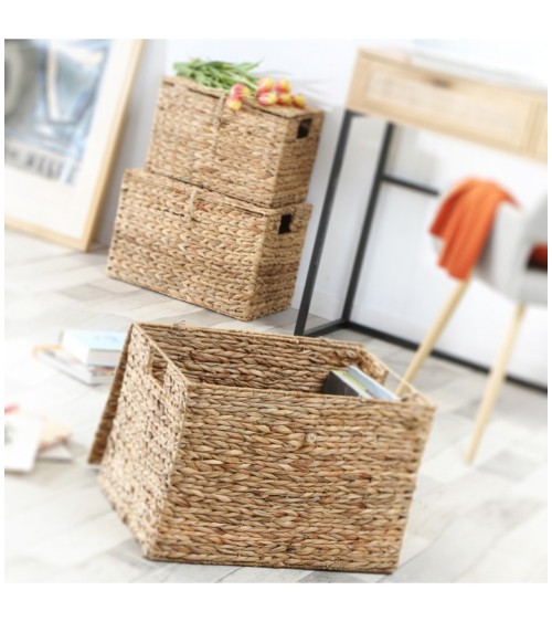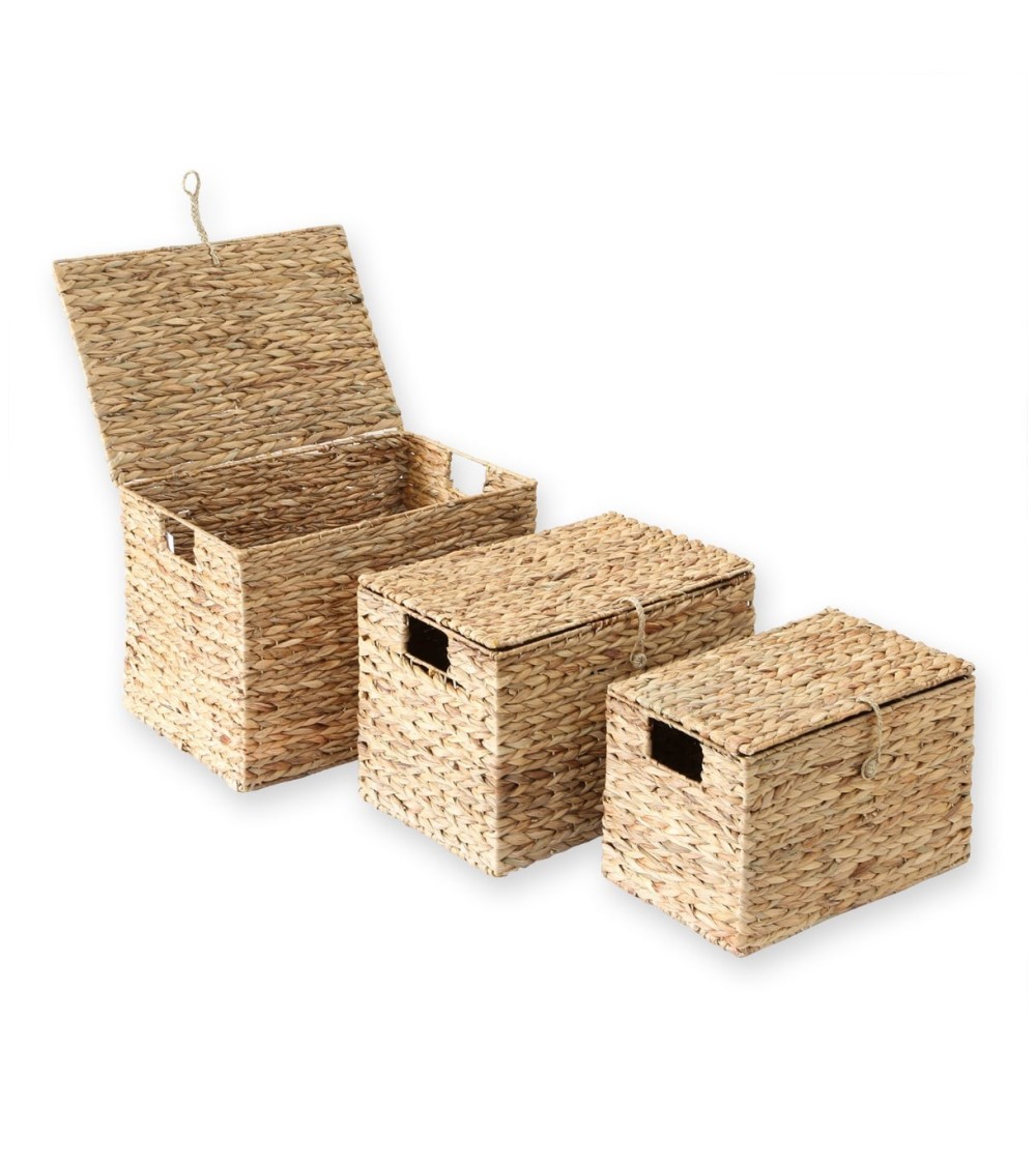 Avec le lot de 3 coffres en Jacinthe d'eau avec couvercle, profitez d'éléments de rangements décoratifs qui donneront un style naturel à votre intérieur en plus d'apporter des rangements supplémentaires.Pratique et design, ces 3 paniers de tailles variables sont emboîtables et vous permettront de ranger toutes vos petites affaires.Les paniers sont tous équipés de deux poignées de chaque coté pour le transport, ainsi que d'un petit lien vous permettant d'ouvrir les couvercles.La Jacinthe d'eau est tressé autour d'une structure en métal pour plus de solidité. Matières : Jacinthe d'eau et MétalDimensions : Grand: 50 cm X 35 cm X H34 cm / Moyen : 45 cm X 30 cm X H30 cm / Petit: 40 cm X 25 cm X H25 cm