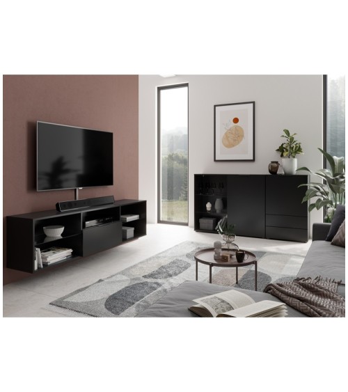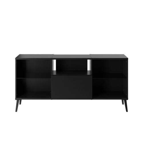 Optez pour notre meuble TV 1 Tiroir 5 Niches - Dark, idéal pour compléter votre décoration moderne et élégante ! Vous pouvez le placer dans votre salon pour y poser votre télévision mais il vous est aussi possible de la placer en tant que Buffet dans une chambre, un bureau ou une entrée par exemple.Avec ses niches de rangement et son tiroir, il vous sera facile de trouver une place pour vos télécommandes, vos livres, décorations,...De plus, ce meuble TV peut être mural, afin de gagner de la place dans votre salon.Caractéristiques produit :Label PEFC : panneaux de particules fabriqués avec du bois provenant de forêts gérées durablement.Mural : possibilité de fixer le meuble au mur : chevilles non fournies, à adapter selon la typologie de votre murMeuble livré en kit. A monter soi-mêmeFabriqué en panneaux de particules mélaminés, offrant une bonne résistance à l'abrasion, aux rayures et aux tâches.Fabriqué en AllemagneDimensions produit :Largeur 31,5 cm x Longueur 153,5 cm x Hauteur 52 cm Poids net : 23 kgDimensions colis :Longueur 79,1 cm x Largeur 55,5 cm x Hauteur 15,9 cm - Poids brut : 25,98 kg