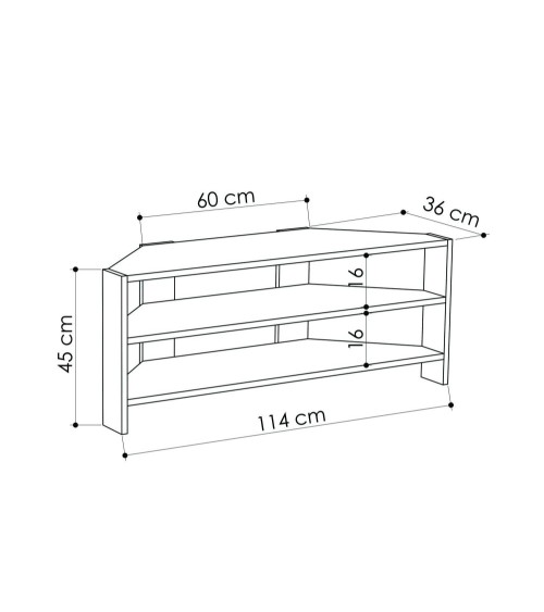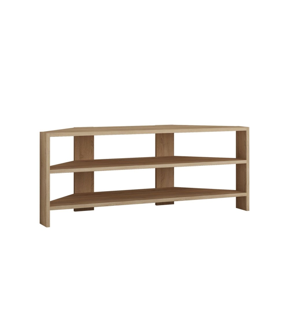 Minimaliste par son allure et tendance par sa forme, ce meuble TV trouvera facilement sa place dans tous les intérieurs.FICHE TECHNIQUE- Structure du meuble TV en mélamine 18 mm marron chêne.- Equipé de trois étagères pour ranger vos décorations.CARACTERISTIQUES TECHNIQUES- Dimensions : L. 114 x l. 36 x H. 45 cm.