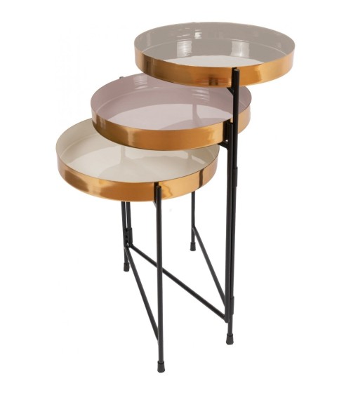 3 Plateaux de table en forme de plateau, cadre réglable, hauteur du rebord de la tablette: 4,2 cmTable rétro utilisable de manière flexible Avec cette table d'appoint, votre intérieur peut être varié à votre guise. Le cadre en métal avec trois plateaux de table ronds peut être positionné de manière flexible. Les trois plateaux de table sont colorés différemment et forment ensemble une image globale attrayante. Grâce aux différentes hauteurs des plateaux de table, ils peuvent être utilisés à la fois comme surface de rangement et à des fins décoratives. Les bords surélevés de la table empêchent les objets de tomber involontairement. Pimentée de bougeoirs ou de vases décoratifs, cette table d'appoint crée une image globale chaleureuse. Cette table combine un style minimaliste avec un caractère rétro tendance et des éléments glamour. Complétez votre intérieur existant avec ce point culminant vivant et utilisez la flexibilité du meuble. La couleur réelle du tableau peut différer des images. 3 Plateaux de table en forme de plateau, cadre réglable, hauteur du rebord de la tablette: 4,2 cm Cadre réglable pour diverses options de réglage Table d'appoint polyvalente Trois plateaux de table ronde séparés Avec une marge élevée Style minimaliste avec caractère rétro et glamour En partie fait à la main Surfaces lisses faciles à nettoyer Adapté à différents styles d'ameublement Plus en détails : Couleurs commerciales : CrèmeCouleur principale : CuivreCouleur secondaire : NoirMotif : UniType de table : Table d'appointUsage extérieur : NonFormat : RondNombre de places : 2Hauteur (cm) : 60,5Longueur (cm) : 30,5Largeur (cm) : 96,5Diametre : 30,5Dimension article : 96,5 x 30,5 x 54 cmPoids du produit (kg) : 5,925Matière principale : MétalMatière : 100% FerStyle : Chic citadinThemes : Urban CityCollection : MrisonAssemblage à prévoir : OuiGarantie : 2