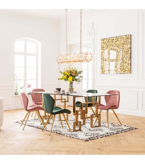 Craquez pour cette chaise rétro au toucher velours qui apportera une élégance indéniable à votre intérieur. Son piètement doré met en évidence l'assise et le dossier incurvés soulignés par des lignes droites. Pour plus d'harmonie, n'hésitez pas à associer autour de votre table tous les modèles de la même gamme : rose, vert et gris. Capacité de charge maximale : 120 kg. Hauteur d'assise : 46 cm. Livrée démontée. Entretien : enlevez les miettes et la poussière avec une brosse douce ou l'aspirateur. Vérifiez que votre produit de nettoyage ne décolore pas le tissu en l'essayant d'abord sur une zone non visible (par exemple sous l'assise).