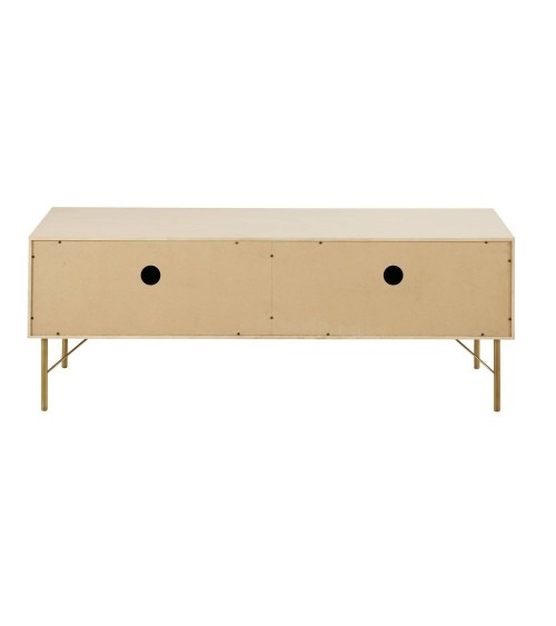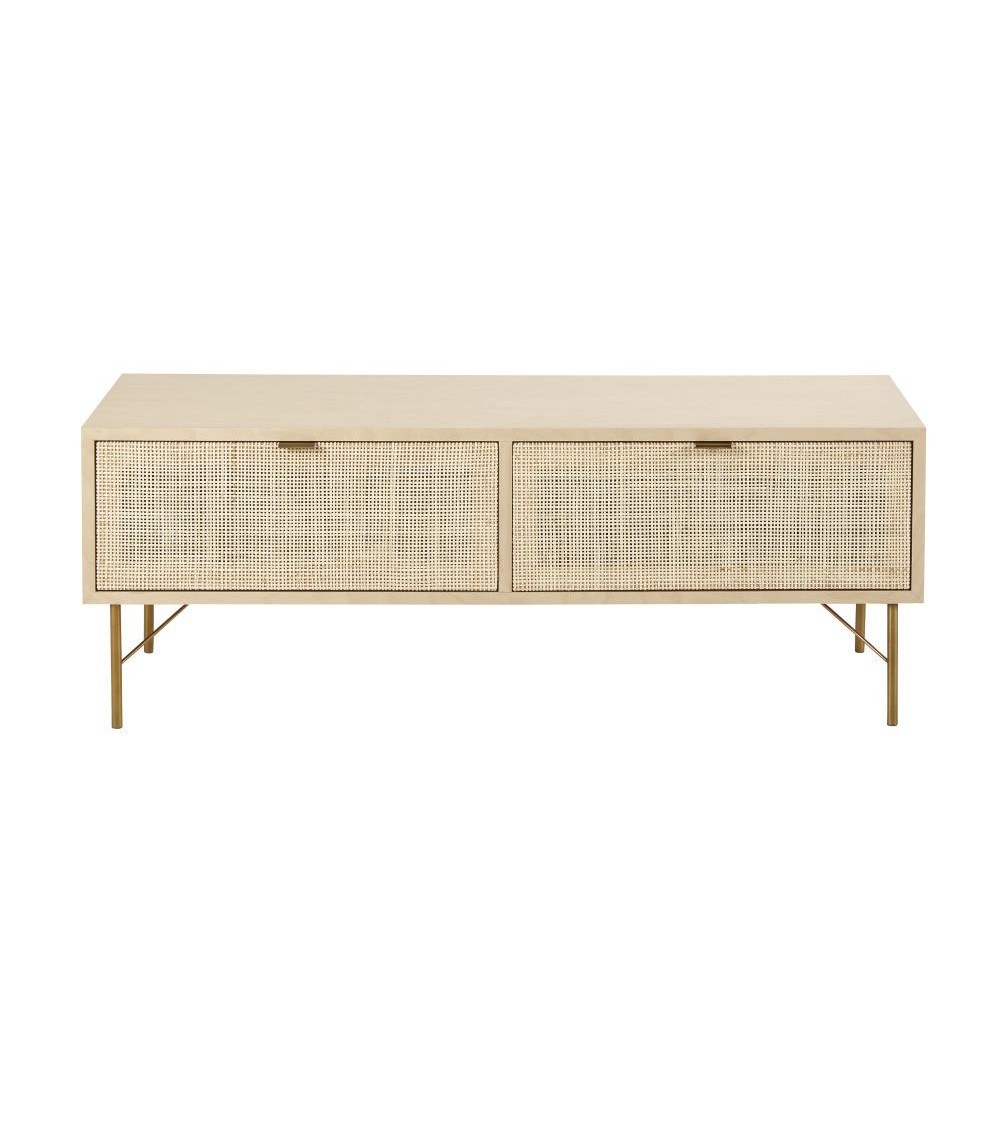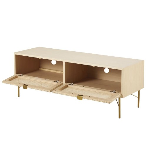 Donnez du style à votre intérieur grâce au meuble TV 2 portes cannage en rotin SOLSTICE ! Très chic avec ses pieds brillants couleur laiton, il revêt également de jolies portes aux façades dotées de cannage en rotin. On craque pour cet ensemble harmonieux combinant élégance, finesse et authenticité. Ce meuble TV se mariera merveilleusement à un canapé en lin aux teintes naturelles ainsi qu'à un guéridon en bois clair. N'hésitez pas à créer un rappel au laiton grâce à quelques lumignons dorés. On valide !