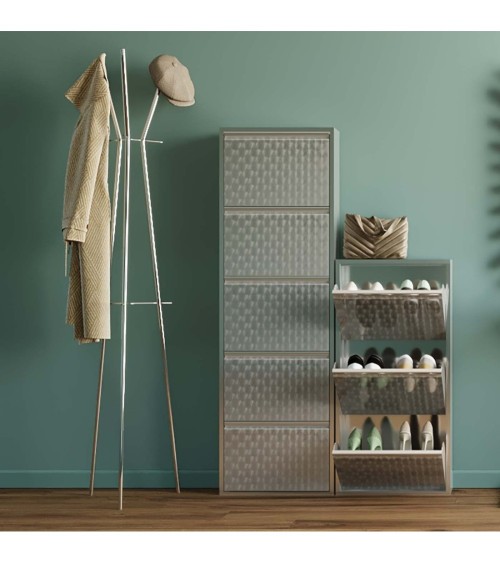Design : Giorgio Cavallo. Minimaliste et intemporel. A fixer au mur pour une meilleure stabilité. Sa largeur vous permet de ranger 2 à 3 paires de chaussures par tiroir. Livré monté. Fabriqué en Italie. Les tiroirs s'ouvrent tous en même temps. Entretien : Passez un chiffon en microfibre pour enlever les traces de doigts et autres salissures de la surface. Vous pouvez l'humidifier avec un peu de liquide vaisselle pour renforcer le nettoyage. Après chaque nettoyage, séchez soigneusement avec un chiffon sec non pelucheux.