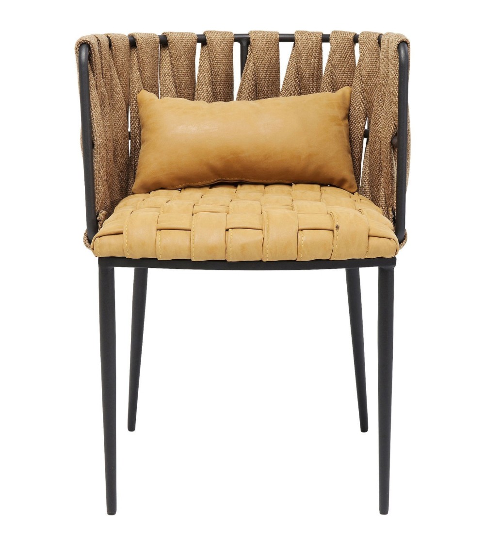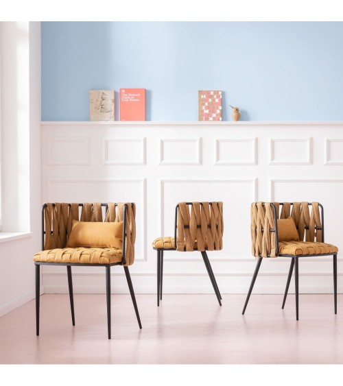 Constituée d'une assise confortable fixée sur une structure en acier laqué, cette chaise avec accoudoirs s'invitera avec plaisir dans votre intérieur. Il séduit particulièrement de par son dossier en lanière tressé qui lui confère un côté résolument design. Sa teinte jaune vous permet de créer un intérieur qui vous ressemble. Existe aussi en gris et en tabouret de bar. Livrée démontée. Hauteur d'assise : 48 cm. Enlevez les miettes et la poussière avec une brosse douce. Vérifiez que votre produit de nettoyage ne décolore pas la matière en l'essayant d'abord sur une zone non visible (par exemple sous l'assise). L'exposition au soleil peut décolorer votre chaise.