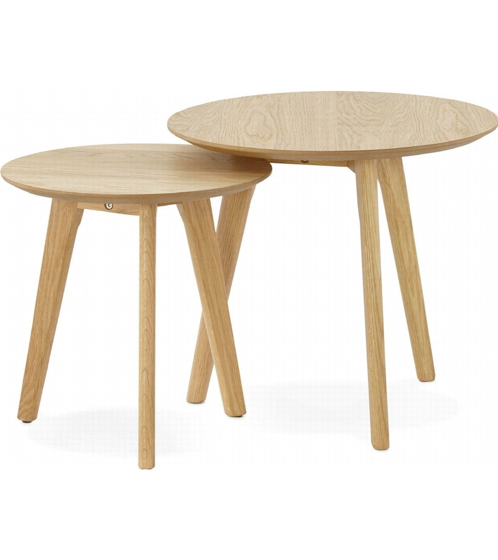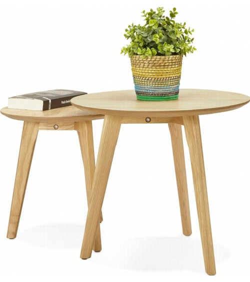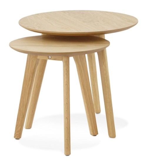Des lignes sobres et intemporelles associées à des matériaux naturels et élégants : le raffinement scandinave dans toute sa splendeur ! Les deux tables gigognes espino sont identiques à un détail près : la différence de hauteur pour un usage polyvalent. Un plateau en bois mdf est fixé sur un piètement en chêne massif légèrement huilé du plus bel effet. Tables d'appoint ou tables basses, au coin d'un canapé ou d'un lit, le duo de tables basses espino sont les accessoires de déco chic et branchée à prix plancher. De quoi parfaire votre déco sans vous ruiner. Table basse design d'une longueur de 50 cm, pour une largeur de 50 cm, et une hauteur de 45cm. Table basse design de couleur bois. Table basse design avec une structure en bois. Plus en détails : Couleurs commerciales : Bois clairCouleur principale : Bois clairCouleur secondaire : Bois clairMotif : UniType de table : Table basseUsage extérieur : NonFormat : RondNombre de places : 2Hauteur (cm) : 45Longueur (cm) : 50Largeur (cm) : 50Diametre : 50Dimension article : 50 x 50 x 54 cmPoids du produit (kg) : 9,79Matière principale : BoisEssence : ChêneMatière : Bois, Chêne massif, Chêne massif, MDF plaqué Chêne,Matière de la structure : Chêne massifMatière des pieds : Chêne massifMatière des tablettes : MDF plaqué ChêneStyle : ScandinaveThemes : Urban CityCollection : EspinoAssemblage à prévoir : OuiGarantie : 2